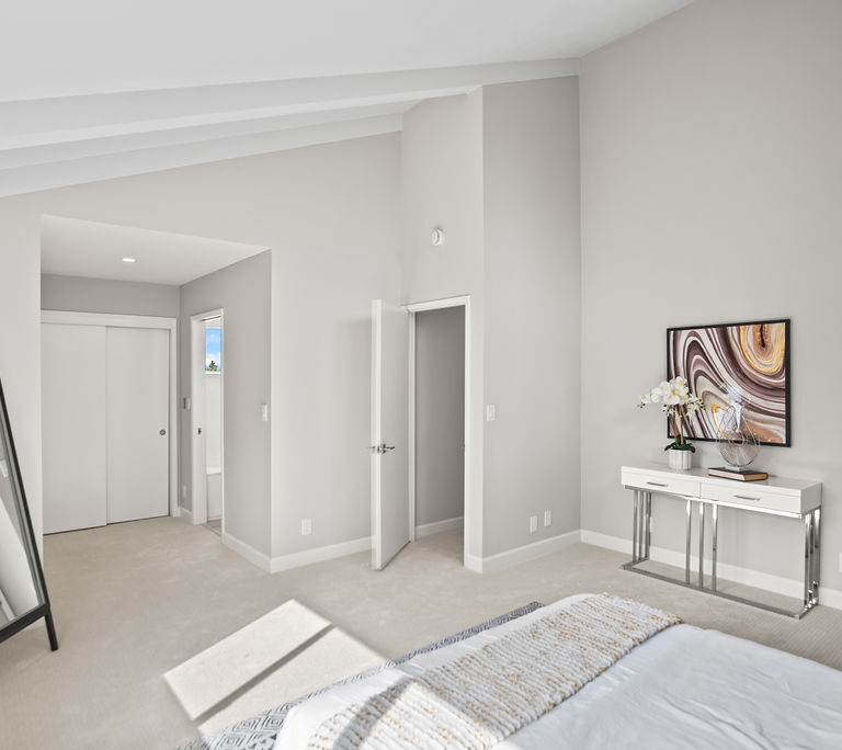 The primary bedroom has high windows, a nook for seating/storage, two closets, and a spacious en-suite bathroom.